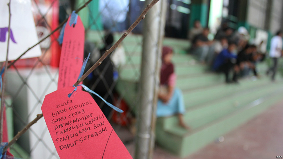 Salah-satu upaya yang dilakukan oleh kelompok relawan adalah memberikan pendampingan psikologi kepada anak-anak warga Islam Syiah -- yang mengungsi di gedung olah raga kota Sampang. Salah-satu terapinya adalah menuliskan harapan anak-anak itu usai kekerasan tersebut. (Foto-foto: Heyder Affan)