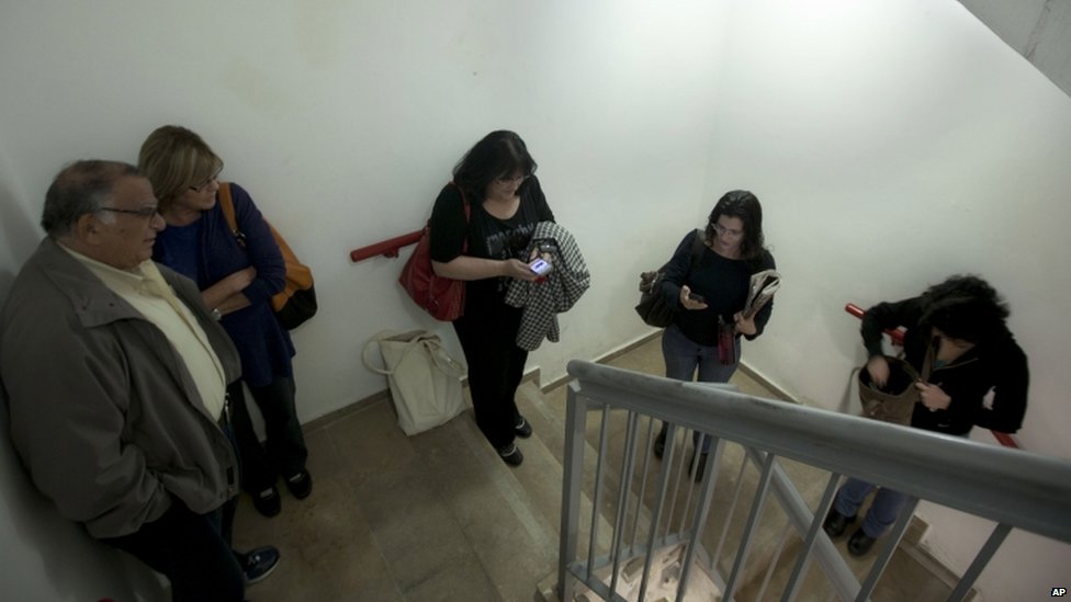 Warga Israel di Jerusalem berlindung di tangga rumah sakit setelah terdengar bunyi sirene sebagai peringatan adanya serangan roket. Serangan roket ke wilayah Israel yang ditembakkan dari Gaza antara lain mengenai Tel Aviv dan Jerusalem.