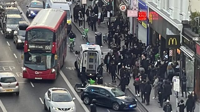 100 officers were called to Clapham High Street on Tuesday where young people were reported to be attempting to access shops and a restaurant, light fires and set off fireworks.
