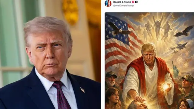 トランプ氏が投稿した画像は人工知能(AI)によるもので、キリストのような衣を着て、両手を光らせたトランプ氏が、病院のベッドに横たわる病人をいやすように見える。空には星条旗や戦闘機、国鳥のワシのほか、正体不明の人物たちが光る太陽を背に浮かんでいる。病人の周りには、軍人や看護師のように見える人たちが集まり、祈るように手を合わせている女性もいる。