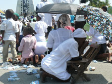 Mientras la misa católica fue acompañada por el solitario sonido de un tambor, los protestantes eligieron una orquesta de músicos que hizo bailar a los presentes frente al palacio presidencial.