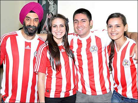 Aliento a la "albirroja". Los colegas de trabajo de Felipe Méndez en Asunción interrumpieron labores para seguir la transmisión del partido contra Italia. Hasta el jefe hindú de Mercadeo, Mohanbir Sawhney, se puso la casaca.