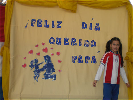 Aleida Sol Caballero alentó a la selección paraguaya en el festejo del día del padre en su escuela de Pilar, Paraguay.