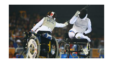 La esgrima está abierta a los atletas en silla de ruedas, cuyas deficiencias pueden incluir lesiones de la médula espinal, amputación de miembros inferiores y parálisis cerebral y cuya situación les impide competir contra atletas de pie.