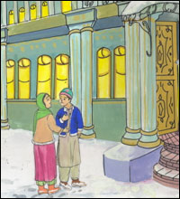دا ځل انور ځوانکى هلک د خپلې خور نوريې سره د لومړي ځل لپاره ماڼۍ ته ځي. له ورايه د ماڼۍ په ليدو ډير حيرانيږي چې څومره ښکلي او لوړ ديوالونه لري، په سپينو واورو پوښلو ونو او بوټو ماڼۍ ته لازياته ښکلا ورپه برخه کړې ده. د ماڼۍ د انګر تر مخ ديوعجيب سړي د څيرې په ليدلو د خوښۍ احساس کوي چې رنګارنګ جامې يې په غاړه اودپيريانوپه څيرخولۍ يې په سرده. له روغبړ وروسته پوهيږي چې همدا د قصر ټوکمار ، يانې لالو ماما دى چې د يوې کتابچې د پاڼو په اړولو بوخت دى.. لالو ماماد خپلې همېشنۍ مينې له مخې ميلمنو ته تود هر کلې وايي او هغوى په داسې حال کې د ماڼۍ دهليزنوته له ځانه سره بيايي چې هماغه کتابچه يې په لاس کې ده او په وار وار يې پاڼې اړوي رااړوي. ماشومان د لالو څخه پوښتي چې ولې پريشانه دى او دکتابچې پاڼې بيا بيا اړوي؟ لالو وايي چې کاشکې يې د نورو په څير ښوونځى لوستى واى او س به يې د پاچا ياداشتونه چې ده ته يې ورکړي دي په اسانه لوستلاى شواى.. نوريه ورته د انور په هکله وايي چې انور هم ښوونځى نه دى لوستى ، په لاره کې يې يو شمير زده کوونکي وليدل چې سبقونو ته تلل ،ډير خپه شو چې دزيات عمر په درلودلو نشي کولاى ښوونځى ولولي. لالو ماما دهغوى په خبرو کې ورننوځي او په خپل حال افسوس څرګندوي چې د زيات عمر له کبله ورڅخه د زړه کړې وخت تير شوى او وايي چې دانور د زده کړې وخت اوس هم نه دى تير شوى او کولاى شي ښوونځي ته ولاړ شي او ليک لوست زده کړي،.چې په دې هکله ورته يوه دريڅه پرانيزي.