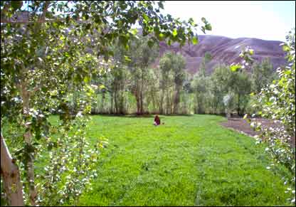 ميرويس او تمنا د ماڼۍ په انګړ کې له لالو ماما سره ويني او تر روغبړ وروسته لالوماما هغوی ماڼۍ ته دننه بيايي. مېلمانه په ماڼۍ کې يو نوی دالېز چې، دوی تر اوسه نه وي ليدلی او طلايي رنګ لري، ويني. تمنا او ميرويس د نوي دالېز په ليدو خوښي څرګندوي. تمنا پر دېوال ځوړند د بودا د مجسمې يو انځور ويني، تمنا نه پوهېږي چې، دا مجسمه د چا ده. مېلمانه له لالو ماما څخه غواړي چې، په دې باب يوه دريڅه ورته راپرانيزي. لالوماما هم د هغوی خبره مني او په دې اړه يوه دريڅه ورته راخلاصوي . دريڅه خلاصيږي مېلمانه په دريڅه کې دننه د باميانو ولايت ويني چې، سره له دومره ګرمۍ يې پر غرونو باندي واوره ليدل کېږي. لالو ماما وايي چې، پر دغو غرونو تل واوره ليدل کېږي او په ژمي کې خو دومره واوره ورباندي پرته وي چې، ان کله ناکله لاندي راښوييږي هم. ميرويس له يوه زلمي څخه چې، خپله رمه څروي پوښتي چې، د باميانو خلک څه شی کري؟ زلمی وايي چې، غنم، جوار، باقلي او مشنګ کري او ځينې خلک د مڼو او زردالو باغونه هم لري، دغه ډول باميان د چنار ونې هم لري. په دې وخت کې يو سړى چې، پر اس سپور وي تېرېږي، تمنا له هغه سړي څخه پوښتي چې، د باميانو خلک په کومو کارونو بوخت دي؟ سړى له اس څخه راکښته کېږي او وايي: ” د باميانو خلک په کرنه او مالدارۍ بوخت دي، ښځې يې غالۍ، ټغر، ليمڅی (کراسته) اوځينې نور لاسي ګنډل کوي او له دې لارې خپل ژوند پرمخ بيايي“. لالو ماما وايي چې، د باميانو ولايت ډېر تاريخي اثار هم لري او د دې ولايت خلک په دري ژبه او هزاره ګي لهجه خبرې کوي. په دې وخت کې يو بهرنى سړى راځي، خپل ځان معرفي کوي او وايي چې، زما نوم (ډيويډ) دی د ډنمارک هېواد اوسېدونکی يم او مورنۍ ژبه مې دري ده“.