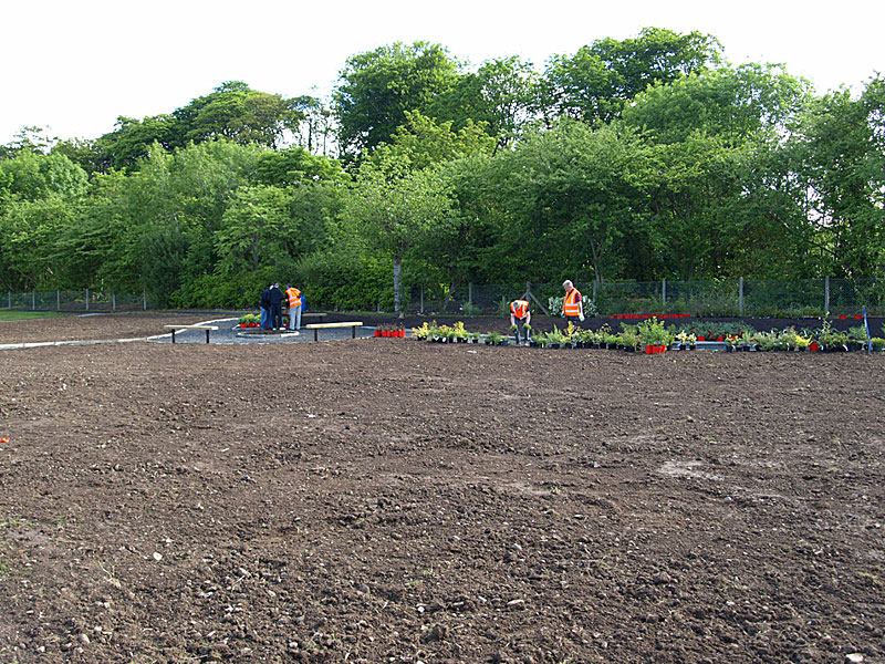 The basic concept is a winding path running through the grassed area linking with the existing paths and riverside walk. A circular seating area is surrounded with flower beds. A low bank between the existing path and the new one is planted up with shrubs. Standard trees are planted along the pathways. Approx. 200m of new paths.