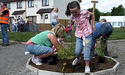 Fragrant and nectar rich plants can be planted around the seating area. A bog garden and block planting behind the houses can be left for a later phase. Standing stones, railway sleepers, posts, information signs etc can be scattered throughout to form focal points along the walkway as budget and time dictates.