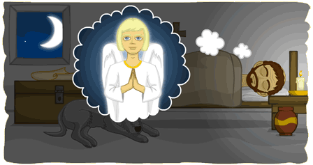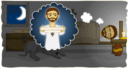 Maith mo mhadadh. An bhfuil a fhios agat go ndearnadh brionglóid dom go raibh muintir na hÉireann ag glaoch orm dul ar ais chucu? (Ceann an mhadaidh á thochas aige.) Bhí mé i mo sclabhaí in Éirinn fadó. Cad é atá i gceist?