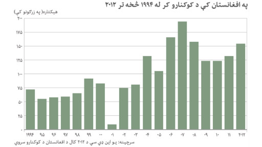 د ملګرو ملتونو او افغان حکومت شمېرې ښيي چې په ۲۰۱۲ ال کې د کوکنارو زیاتره کښت ۹۵٪ د هېواد په لوېديځ او سوېلي ولایتونو کې و.