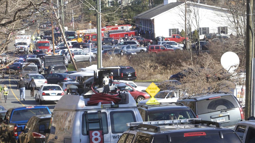 • عينې شاهدانو ويل دوی ان تر ۱۰۰ پورې ډزې اورېدلې، او وېرېدلې ماشومان يې ليدلي چې په نيوټاون کې د سانډي هوک نومي دغه ښوونځی په تېښته وو.