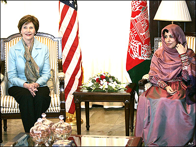 د افغانستان ولسمشر حامد کرزى او د امريکا د متحدو ايالاتو ولسمشر جورج ډبليو بوش په خپلو کې څه کم دوه ساعته خبرې اترې وکړې . وروسته ښاغلي بوش په کابل کې د متحدو ايالاتو د سفارت د بنسټ ډبره کېښوده . د ولسمشر حامد کرزي ميرمنې ډاکټر زينب کرزۍ هم د متحدو ايالاتو د ولسمکشر بوش ميرمن لورا بوش خپل حضور ته ومنله . ښاغلي کرزي په خورا توده ژبه افغانستان ته د خپل امريکايي سيال او د هغه د ميرمنې لورا بوش د سفر هر کلى وکړ او ښاغلى بوش يې د افغانستان د خلکو يو مضبوط ملاتړى وباله . ښاغلي بوش د ولسمشر کرزي د مشرتابۀ ستاينه وکړه او هغه يې د افغانستان سولې ، امنيت او پرمختيا ته وفاداره شخصيت وباله .