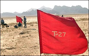 تيمهای مين روبی، با اين گونه پرچمهای سرخ رنگ، به مردم هشدار می دهند که به مناطقی که دارای مين است نزديک نشوند