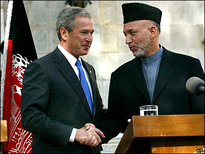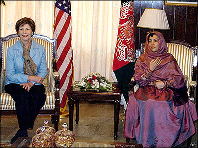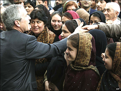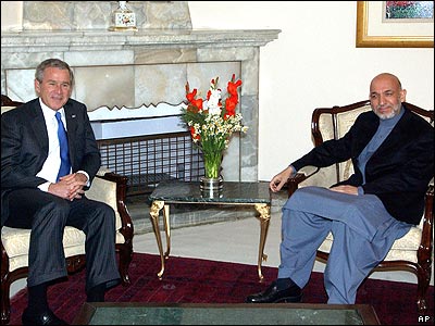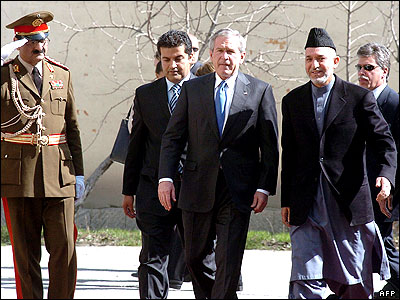جورج بوش رييس جمهور آمريکا، روز چهارشنبه 1 مارس، به گونه غير منتظره ای وارد کابل پايتخت افغانستان شد. او از پيشرفت افغانستان در زمينه دموکراسی و آزادی مطبوعات تقدير کرد و به حامد کرزی همتای افغان خود گفت که افغانستان، کشورهای ديگر را به تحرک واداشته است. لارا بوش همسر رييس جمهور و کاندوليزا رايس وزير خارجه آمريکا، آقای بوش را در اين سفر همراهی می کردند.