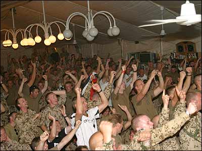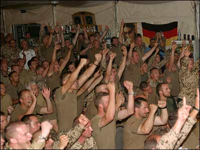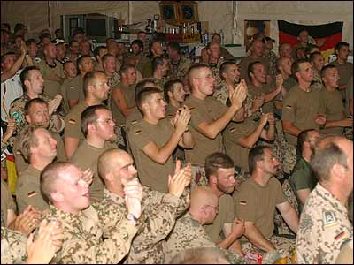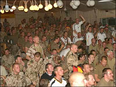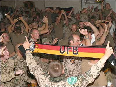 صدها سرباز آلمانی هزارها مايل دور از آلمان در افغانستان مسابقه روز جمعه (3 ژوئن) کشورشان با آرژانتين را به دقت دنبال کردند. سربازان و صاحب منصبان آلمانی در يک پايگاه کلان در هوای گرم سوزان مزار شريف و در زير يک چادر جمع شده بودند تا از پشت پرده تلويزيون تيم ملی کشورشان را در مقابل آرژانتين تشويق کنند. در شهر شمالی مزارشريف حدود دو هزار سرباز آلمانی مستقر هستند. در نيمه اول بازی که بازی به نفع آرژانين بود، ياس و نگرانی در چهره سربازان آلمانی ديده می شد، اما گل دقيقه 80 کلوزه همه چيز را تغيير داد و سربازان آلمانی در مزار شريف شروع به رقص کردند و ...