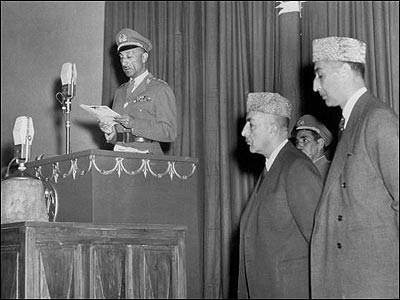 ظاهر شاه (سمت چپ) در سخنرانی افتتاح لویه جرگه قانون اساسی افغانستان. محمد داوود پسر عموی ظاهر شاه نیز که درسال 1973 با کودتایی سفید، او را از سلطنت خلع کرد و حکومت افغانستان را به جمهوری تغییر داد، در این عکس (نفر وسط) دیده می شود