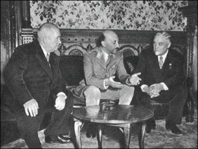 ظاهر شاه (وسط با لباس نظامی) به همراه نیکیتا خروشچف رهبر شوروی (سمت چپ) در کابل