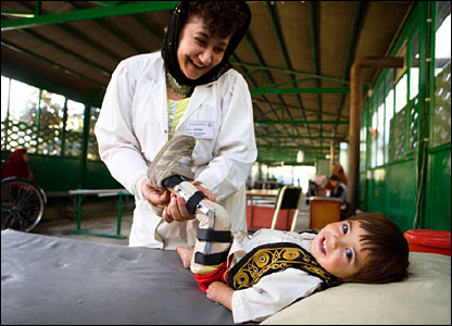 روح افزا، فيزیوتراپيستی که خود در اثر انفجار يک مين پایش از دست داده، مشغول درمان یک کودک افغان است. اين درمانگاه ويژه معلولان، معمولا کسانی را به کار می گمارد که خودشان معلول هستند. |