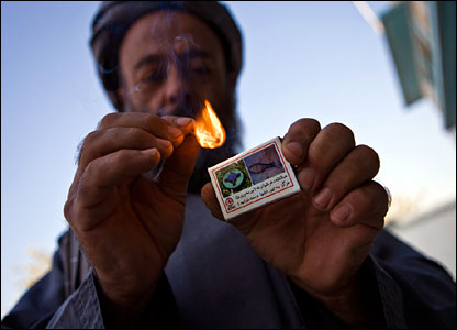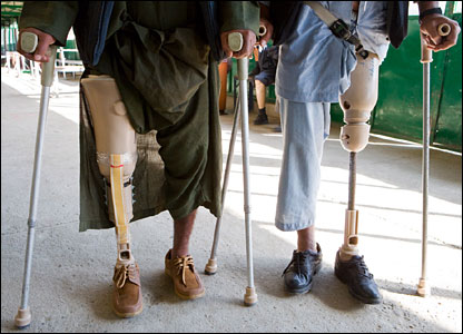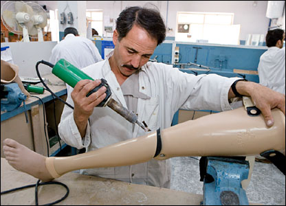 يکی از کارمندان مرکز ارتوپدی صلیب سرخ، مشغول ساختن يک پای مصنوعی در درمانگاهی در کابل است. اين مرکز همچنين ویلچر (صندلی چرخ دار) و عصا در اختیار معلولان قرار می دهد.