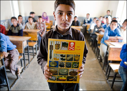 اداره هلال احمر افغانستان به دانش آموزان افغان در مکاتب (مدارس)، خطرات ناشی از مين های ضد نفر را آموزش می دهد.