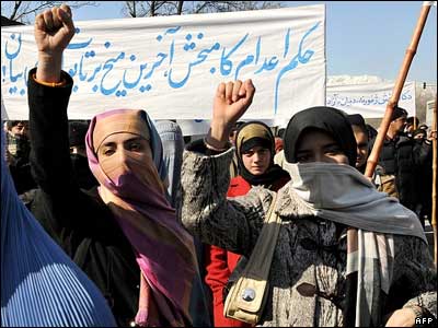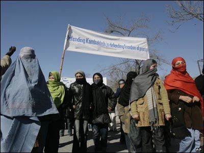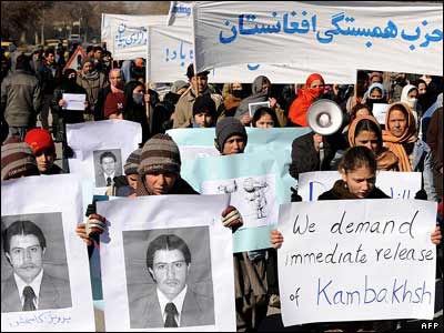 حدود دوصد تن از مردم کابل، در اعتراض به صدور حکم اعدام برای پرویز کامبخش، روزنامه نگار افغان در بلخ، در برابر دفتر سازمان ملل متحد در کابل دست به تظاهرات زدند.