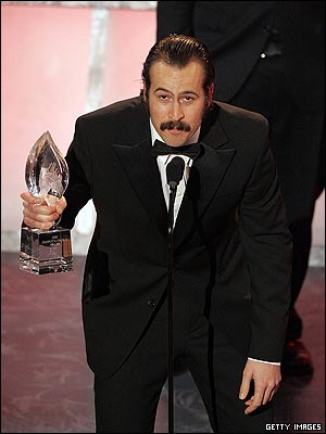 هريسون فورد، از بازيگران نخستين قسمت جنگ ستارگان، جايزه بهترين فيلم انتخاب مردم را به جورج لوکاس کارگردان فيلم جنگ ستارگان، انتقام سيت می دهد