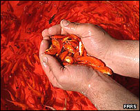 در اطراف شهر رشت در استان گیلان برخی کشاورزان برنجکار تمایل ویژه ای برای پرورش ماهی قرمز پیدا کرده و شالیزارهای خود را به تولید این ماهی های کوچک و زیبا اختصاص داده اند. در میان آب گل آلود استخرها ماهی های قرمز به چشم نمی آیند، اما به محض این که دریچه استخرهای خاکی باز می شود آدمی در حیرت می ماند که این موجودات زیبا و ریز در میان این آب گل آلود چطور زنده مانده اند. استخرهای پرورش زیاد عمیق نیست و مساحت آنها معمولا از 500 متر شروع می شود و گاه به 2000 متر و بیشتر هم می رسد. تعداد ماهی های استخر به سادگی قابل محاسبه نیست. برای یک استخر 500 تا 600 متری حدود 700 هزار تومان قیمت گذاشته می شود و تولید کنندگان می گویند حداقل 30 هزار ماهی قرمز دارد. برای استخر دو هزار متری حدود دو میلیون تومان قیمت گذاری شده و گفته می شود حدود 100 هزار ماهی قرمز دارد. البته بسته به تعداد ماهی های استخر اندازه ماهی ها فرق می کند. هر چه تعداد ماهی استخر بیشتر باشد، اندازه آنها کوچکتر است. اواسط بهمن ماه خریداران اصلی و توزیع کنندگان ماهی قرمز سروکله شان پیدا می شود و ماهی های تولید شده را به صورت کلی برای توزیع در سراسر کشور خریداری می کنند.