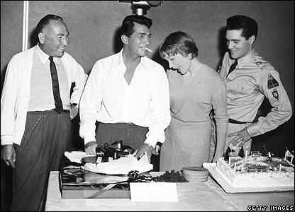 الویس پریسلی با دین مارتین دومین نفر از سمت چپ و شرلی مک لین در جشن تولد دین مارتین در سال ۱۹۶۱.