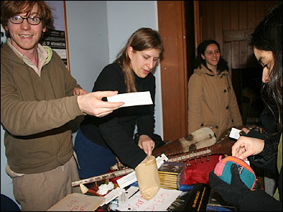 شماری از حاضران کنسرت، از یک نوازنده افغان، امضا می گیرند