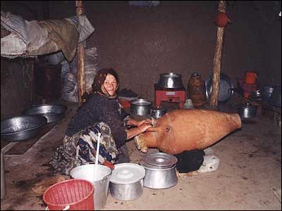 زنی از روستای نئور در حال درست کردن کره از دوغ بوسيله مشک