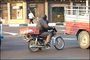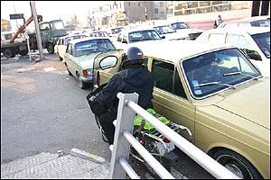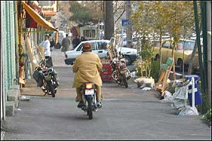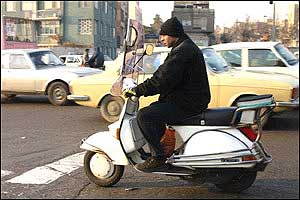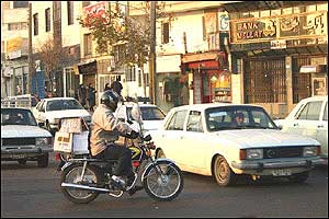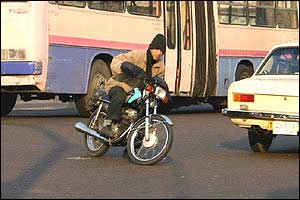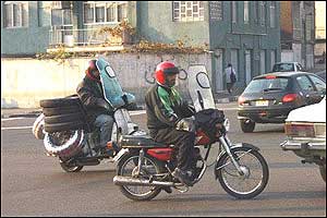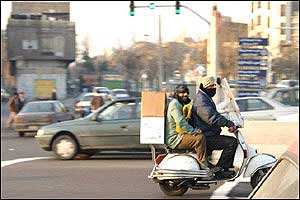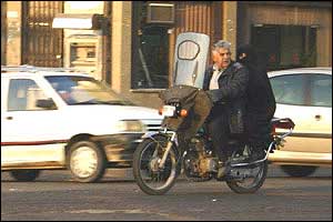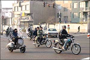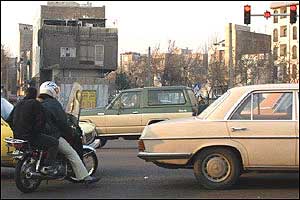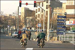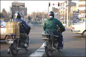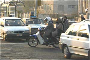 هرچند امروزه مشکل ترافيک به عنوان يکی از معضلات در بسياری از شهرهای بزرگ مطرح است، ترافيک شهر تهران از جهاتی منحصر به فرد بوده و به همين دليل هم باز شدن اين گره کور مستلزم حل دامنه وسيعی از مسائل مسبب آن است. فرسودگی و عدم پاسخگويی ناوگان حمل و نقل عمومی، لزوم مراجعه حضوری به شرکتها، ادارات، بانکها، فروشگاهها و ... جهت انجام امور روزمره و نبود تفريحی جز گشتن در خيابان برای عامه مردم، همه و همه به نوعی مختص اين شهر هستند. در تهران مشکل تنها شلوغی خيابانها و آلودگی هوا نيست، بلکه نبود فرهنگ صحيح آمد و شد در ميان رانندگان وسايل نقليه و عابرين پياده نيز خود داستانها دارد. اخيراً با تصويب مجموعه جديدی از قوانين در مجلس (که بسياری از مواد آن خود جای بحث دارد)، راهنمايی و رانندگی تهران بارها اعلام داشت که از پانزدهم آذرماه اين قوانين را با جديت اجرا خواهد کرد. اما آنچه که در اين يک هفته در خيابانهای تهران شاهد آن بوديم، اجرای پراکنده قوانين در خصوص اتومبيلها بوده است. عابرين پياده و موتورسيکلتها همچنان در حضور ماموران راهنمايی و رانندگی بديهیترين اصول زندگی شهری را نقض میکنند و استانداردهای رانندگی در تهران کماکان از حداقلهای قابل قبول بسيار فاصله دارد. در اين ميان رانندگان موتورسيکلتها که به تازگی در کنار تاکسیها به جابجايی مسافر هم میپردازند نه تنها خود را پايبند به هيچ يک از قوانين راهنمايی و رانندگی نمیدانند، بلکه ظاهراً ارزش چندانی هم برای جان خود و همسفرانشان قائل نيستند. هنوز قوانينی همچون لزوم استفاده از کلاه ايمنی، داشتن پلاک و رعايت تعداد سرنشين مجاز در مورد اين وسايل به درستی اجرا نمیشوند. اين تصاوير در يکی از چهارراههای جنوب شرق تهران (تقاطع خيابانهای نيروی هوايی و دماوند) در تاريخ ۲۲/۹/۸۲ بين ساعت ۳ تا ۴ بعدازظهر و در حضور مامور راهنمايی و رانندگی تهيه شدهاند.  | | عبور جمعی موتورسيکلتها از چراغ قرمز | |