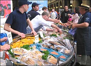 | | فروشنده نمونه غذای طبخ شده را به مشتريان ارائه ميکند |