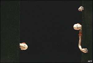 'باتوه' گروه رقصنده ژاپنی در صحنه ای از نمايش 'سان کای جوکو' به کارگردانی 'یوشیو آماگاتسو' در سالن تئاتر دلاويل فرانسه: اين نمايش از 15 تا 30 دسامبر بر روی صحنه خواهد بود.