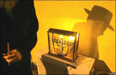 در دومين روز از تعطيلات يهوديان، ياکپف ناگار، يکی از شهرک نشينان سابق، در محل موقتی که در جنوب اسرائيل برای سکونت آنان بنا شده، شمع روشن می کند