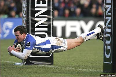 کريس مالون در حال شيرجه و کسب امتياز برای تيمش 'بات' در بازی بين اين تيم و ورچستر وارير از سری مسابقات قهرمانی راگبی گينس