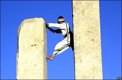 پسر يمنی در حال بالا رفتن از ستون 15 متری که به نام 'سرير بلقيس' خوانده می شود. این بنای تاريخی با 3000سال قدمت در استان مارب، 170 کيلومتری شرق صنعا در يمن قرار دارد. يمن که در نزديکی کشور نفت خيز عربستان سعودی قرار گرفته، از فقيرترين کشورهای جهان محسوب می شود و در سال گذشته 200 فرد خارجی در آن ربوده شده اند.