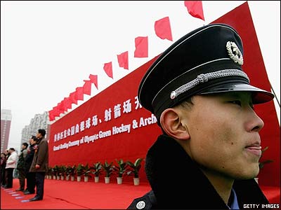 يک مامور امنيتی در حال انجام وظيفه در جريان مراسم آغاز احداث میدان هاکی و تيراندازی مسابقات المپيک 2008 پکن چين.