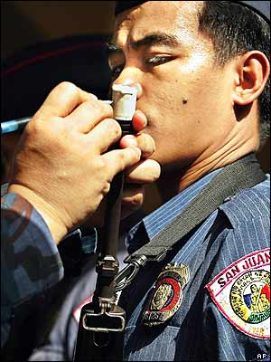 علامت گذاری اسلحه يک پليس فيليپينی در ستاد مرکزی پلیس این کشور در شهر مانيل، پايتخت اين کشور. پليس فيليپين برای جلوگيری از تيراندازی هایی که به نشانه شادی در جریان جشن سال نو شليک می شود و همه ساله در اين کشور چندین قربانی برجای می گذارد تدابير شدیدی را اتخاذ کرده است. |