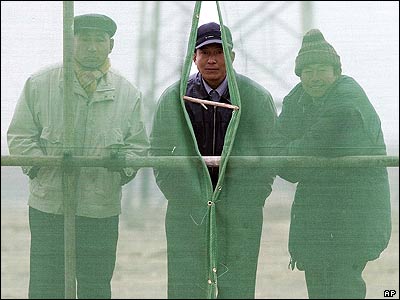 ساکنان سابق زمينی که اکنون ميدان هاکی و تيراندازی مسابقات المپيک ۲۰۰۸ پکن قرار است در آنجا بنا شود از درون يک پرده توری شاهد بر زمين خوردن اولين کلنگ احداث اين استاديوم هستند.