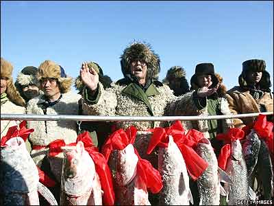 ماهيگيران چينی در جريان يک جشنواره نخستين صيد خود را از درياچه یخزده چاگان در شمال شرقی چين به حراج می گذارند.