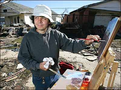 ديگو لارگوييا هنرمند اهل نيو اورلئان، در حال نقاشی کردن صحنه ای از يکی از محله های ويران شده اين شهر. در حالی که حدودا چهار ماه از برخورد طوفان ويرانگر کاترينا با سواحل جنوبی آمريکا می گذرد هنوز بخشهايی از نيو اورلئان و مناطق اطراف آن خالی از سکنه است.