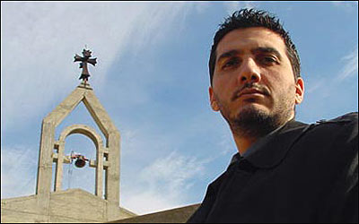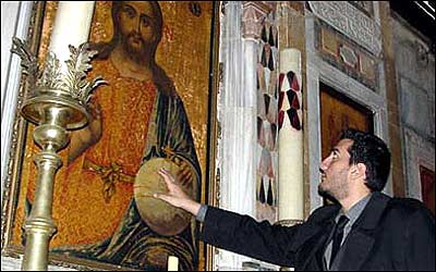 جوزف در حال لمس يکی از تصاوير مقدس صومعه 'دير المخلص'. اين صومعه در سال 1711 اعمار شده است