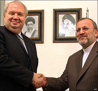 منوچهر متکی وزير امور خارجه ايران در ديدار با کی سيلف معاون وزير امور خارجه روسيه در تهران، در روز آخر مذاکرات ايران روسيه برای حل بحران هسته ای ايران