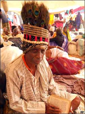 مرتاض هندی در حاليکه اسم 'رام' خدای اسطوره ای مذهب هندو را به صورتش خالکوبی کرده، در جشن رام در شهر راجپور هند.