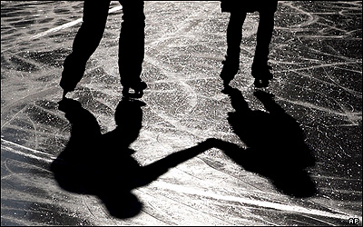 سايه زوجی در حال اسکيت روی يخ که در غرب آلمان گرفته شده است. روز دوشنبه آلمان با جبهه هوای بسيار سردی از سوی اروپای شرقی مواجه شد.