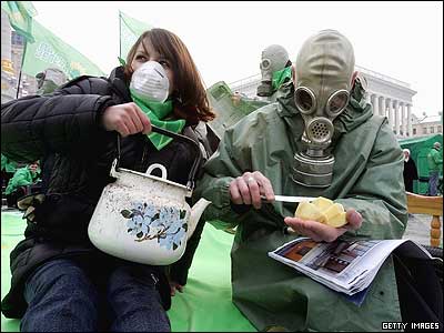 طرفداران حزب سبز اوکراين در مرکز شهر کيف، پايتخت اوکراين در حال پوست کندن سيب زمينی. اين گروه در اعتراض به انبار کردن زباله هسته ای در چرنوبيل و نگرانی اثرات آن در زندگی مردم اين کشور تجمع کرده اند.