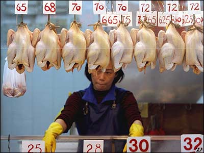 يک مغازه قصابی در شهر هنگ کنگ و انتظار برای فروش مرغ. در گزارشی گفته شده که اخيرا يک نفر در اثر ابتلا به آنفلوانزای مرغی با وجود تحريم واردات مرغ به هنگ کنگ درگذشته است.