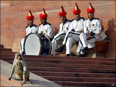 سربازان هندی با آلات موسيقی شان در انتظار آغاز يک رژه در شهر دهلی نو هستند.