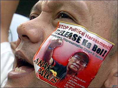 طرفداران کريسپين بلتران، عضو مجمع قانون گذاران فيليپين در مقابل دادگاهی در شهر مانيل تجمع کردند. او يکی از پنج عضو کنگره فيليپين است که از سوی رييس جمهور گلوريا آرويو، متهم به شرکت در يک کودتا شده بودند.