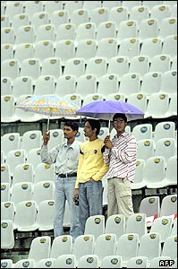 چند تماشاچی، مسابقه آزمايشی کريکت بين هند و انگليس را زير باران و نور کم در استاديوم شهر موهالی در هند دنبال می کنند. |